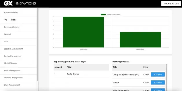 Beheer producten, prijzen, acties en bestellingen vanuit één centrale omgeving. Je ziet orders realtime binnenkomen, past statussen aan en houdt overzicht per kanaal. Alles werkt samen met je bestelsite, QR bestellen en optioneel met onze kassa en keukenscherm.